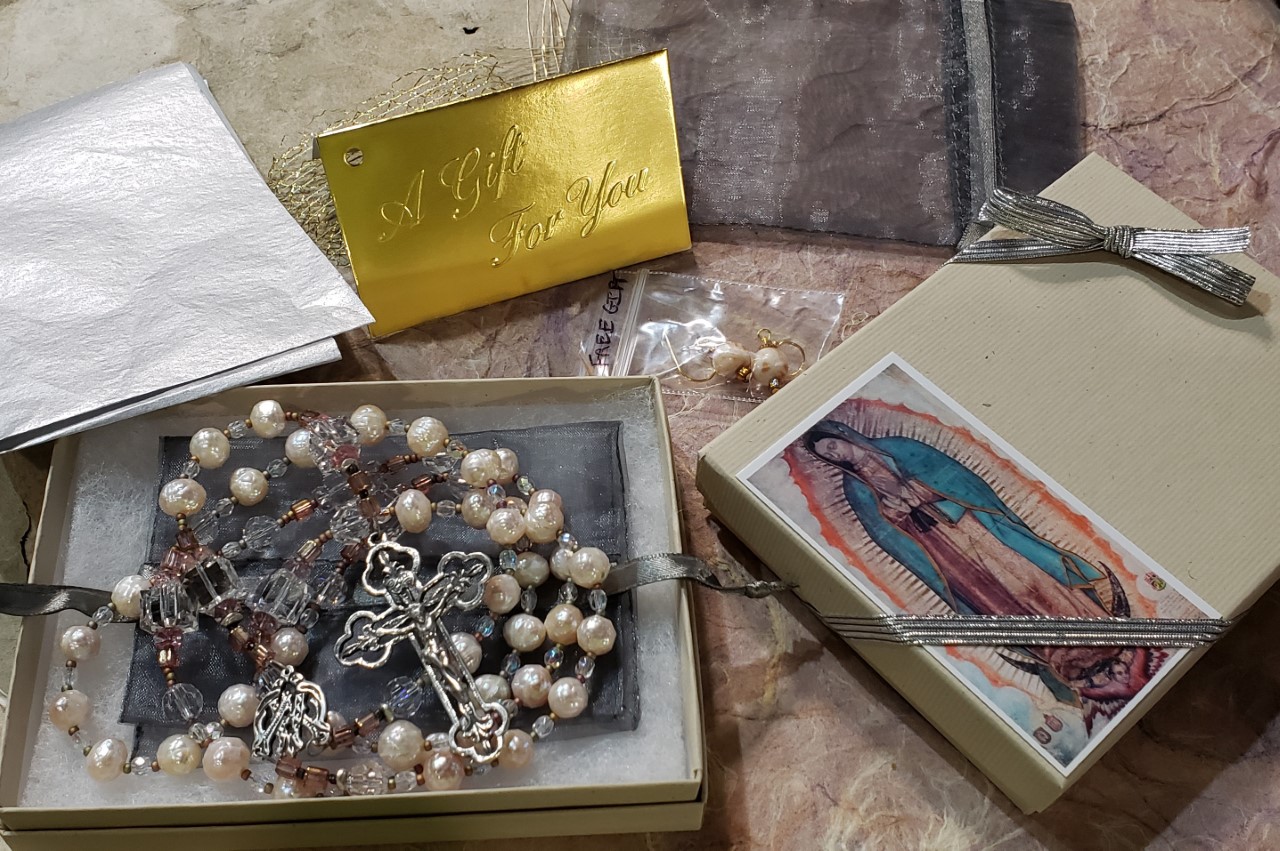 All Rosaries, Chaplets and Religious Jewelry come in a FREE Gift Box with an organza (Gold or Silver) Bag, tissue paper, a (Gold or Silver) elastic bow, and a Prayer Card. Also, a FREE GIFT of handmade earrings are enclosed with your purchase.