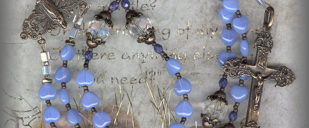 HEART OF THE MOTHER IX: AVE BEADS: 8mm flat glass hearts from of finest Czechoslovakian quality. Milky sapphire translucent”table cuts”. PATER BEADS: Vintage ‘English Cuts’. 12 mm variegated shades of very pale blue, Origin Germany, 1930’s) Each framed with antiqued filigree caps. ………God gave us Mary so we wouldn’t be orphans….. This rosary is a … Continue reading “HEART OF THE MOTHER” ROSARY (XI)- Blue Hearts & English Cut Beads – (21 in) – LEC.22210