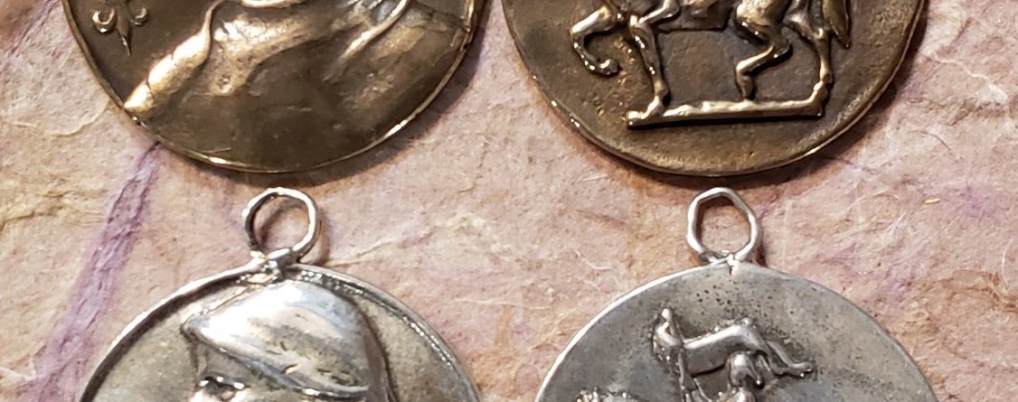 LARGE STE JOAN OF ARC MEDAL: (Born at Domremy in Champagne, on 6 January, 1412; died at Rouen, 30 May, 1431 – Feast day May 30th.) A magnificent medal honoring Ste Joan. Profile of St Joan on one side and Joan on her horse with a banner on reverse. She is the patron saint of … Continue reading LARGE STE JOAN OF ARC MEDAL – antique, France/late 19c (1.75 in.) – MSJN.1