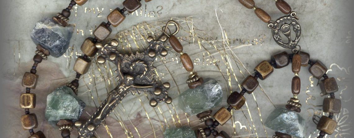 MAY BIRTHSTONE ROSARY AVE: 8mm Brown horn cube PATER: Hand cut faceted fluorite chunks in hues of emerald green capped with wood and antique metal. CRUCIFIX: Lg 19c Crucifix – Europe/1800’s – (3 in. H x 1.8750 in. W) CENTER: EUCHARIST – ANGELS – antique, Europe/early 1900’s – (.75.in.) PATERS ARE MUCH DEEPER GREEN THAN SHOWN DUE TO … Continue reading MAY SKY ROSARY (Birthstone) – Horn & Emerald Green Fluorite (23 in.) RB2.22305.FL