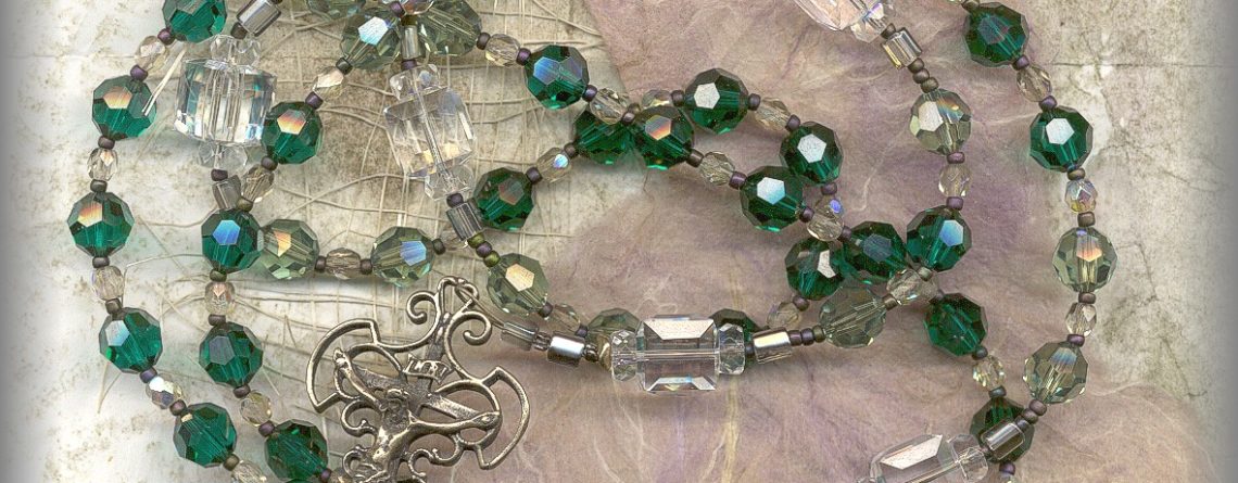 BIRTH STONES:MAY SKY AVE BEADS: 8mm Austrian Swarovski Crystal in shades of emerald moving from dark to light. PATER BEADS: 12mm Austrian Swarovski clear crystal cubes. CRUCIFIX & CENTER: ITALIAN ROSARY SET – Italy/1930’s – (2 in.) CHAPLET CRUCIFIX: FILIGREE FLEUR – antique, origin age unknown – ( 1.5 in. without bail) There is nothing like Austrian … Continue reading MAY SKY ROSARY- Emerald Austrian Crystal – (25.5 in) – RBS.2.2705.SW