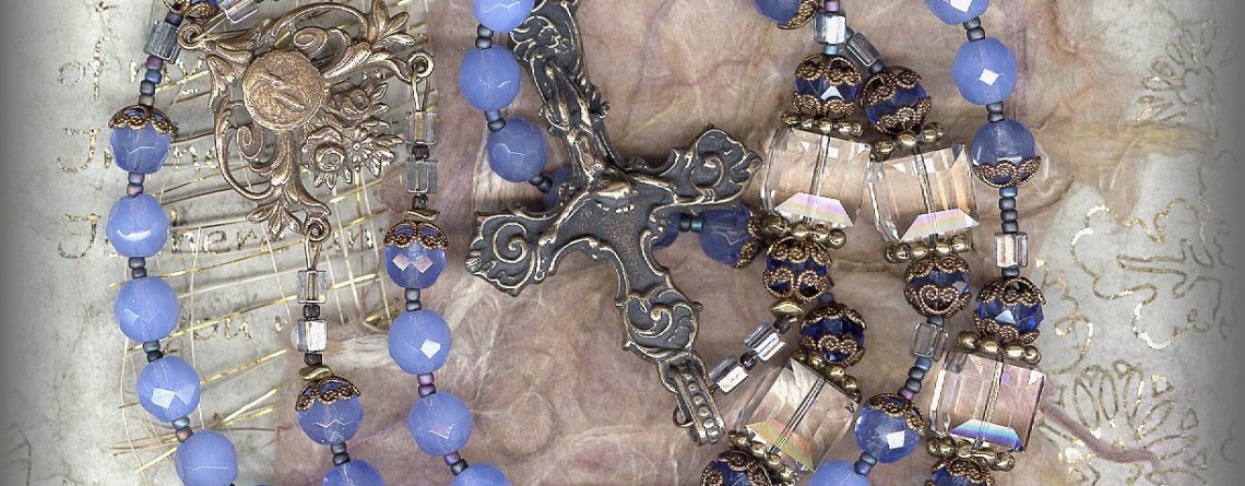REGINA CAELI – QUEEN OF HEAVEN AVE BEADS: 8mm Rare Russian antique faceted glass beads in a rich blue hue. Unable to replace when gone. PATER BEADS: 12mm Austrian Crystal cubes (Swarovski) catch the light beyond belief! Small, 6 mm blue beads with filigree medal caps are found on either side. CRUCIFIX: ELEGANT – antique, Europe/unknown – … Continue reading REGINA CAELI III ROSARY – (Mary Queen of Heaven) – antique blue & Austrian crystal – (28 in.) – RDRC.21808