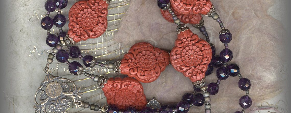 WORDS of MY MOUTH V: AVE BEADS: 8mm Deep purple amethyst beads were found for use in this rosary.Each faceted to bring out their beauty, especially when held in the hand so natural light plays through the stones. PATER BEADS: Rare Cinnabar, hand carved delights the eye and the praying hand. Note the antiqued metal … Continue reading “WORDS OF MY MOUTH” ROSARY (V) – Cinnabar & Deep Purple Facets – (26 in) – RET.21650